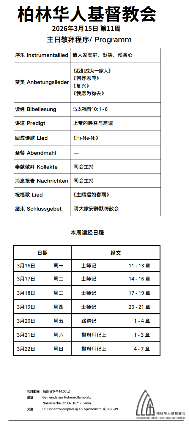 下次特会时间:2026年3月14日(周六)14:00-15:00,由徐立牧师分享《要有属灵洞察力和敏感度》第一百六十四讲