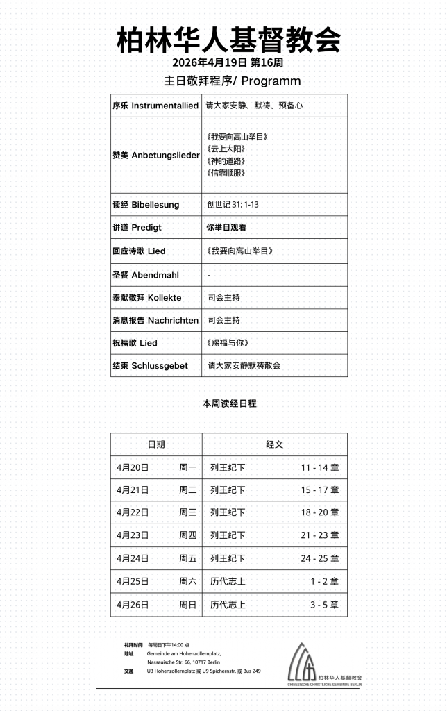 最新讲道视频录音已经发布,欢迎弟兄姐妹们订阅youbube 频道 柏林华人基督教会 收听。